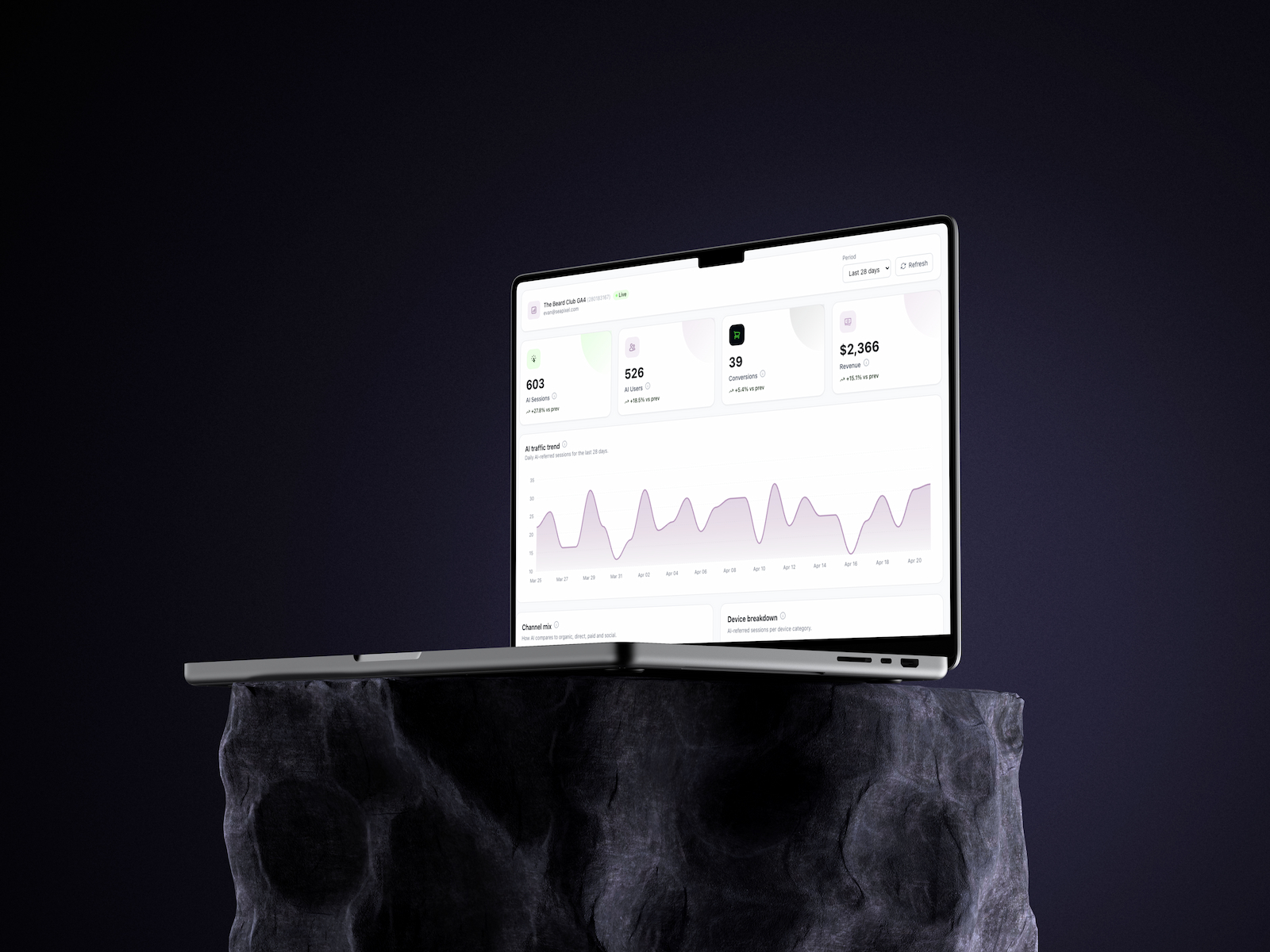 No tagging. No code changes. We pattern-match GA4's session source against the domains of 11+ AI assistants the moment your data syncs.